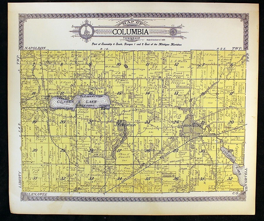 Columbia Township 1911 Plat Map Jackson County Michigan Original