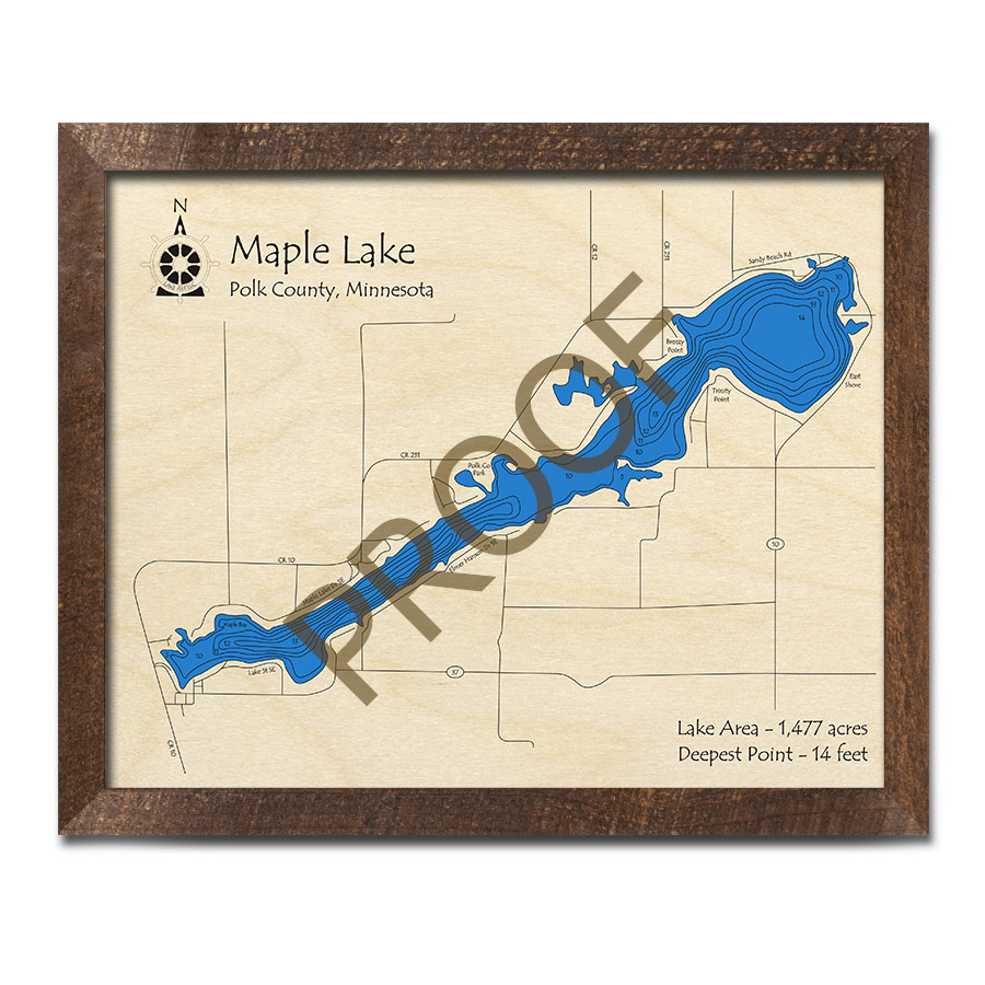 Maple Lake 3D Wood Map, Polk County Minnesota, Nautical Wood